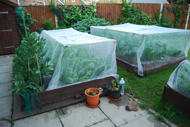 Things have grown so tall this year that we had to put together some quite high covers over the raised beds. Some people do a brilliant job with plumbing pipe frames, but in a hurry we used bamboo and insect mesh and it’s worked quite well. The photo was taken a month ago. Now all four main beds have got these frames over them.