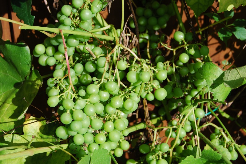 Cutting back a lot of vine leaves today revealed a plenty of grapes coming along nicely; more than we realised we had. The bunch in the photo is a close up. There are another ten or so bunches like it, all now exposed to the sun so hopefully they’ll ripen well.