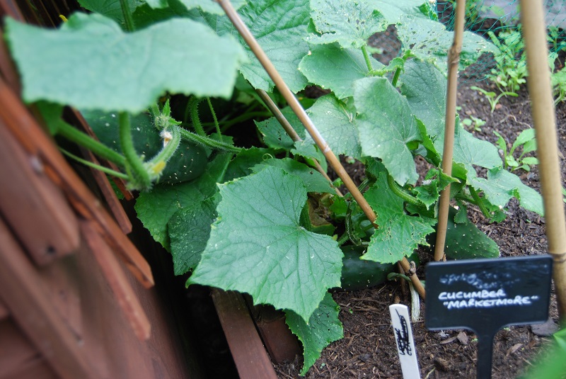 One of the things about cucumber plants is their ability to hide what they’re up to, with their big leaves. All looks quite innocent above, with three healthy Marketmore plants quietly enjoying the day.