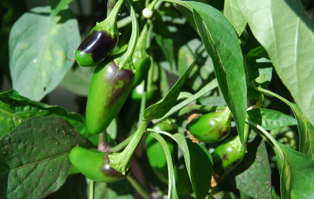 And here the early jalapeño peppers are turning black on their way to scarlet red.