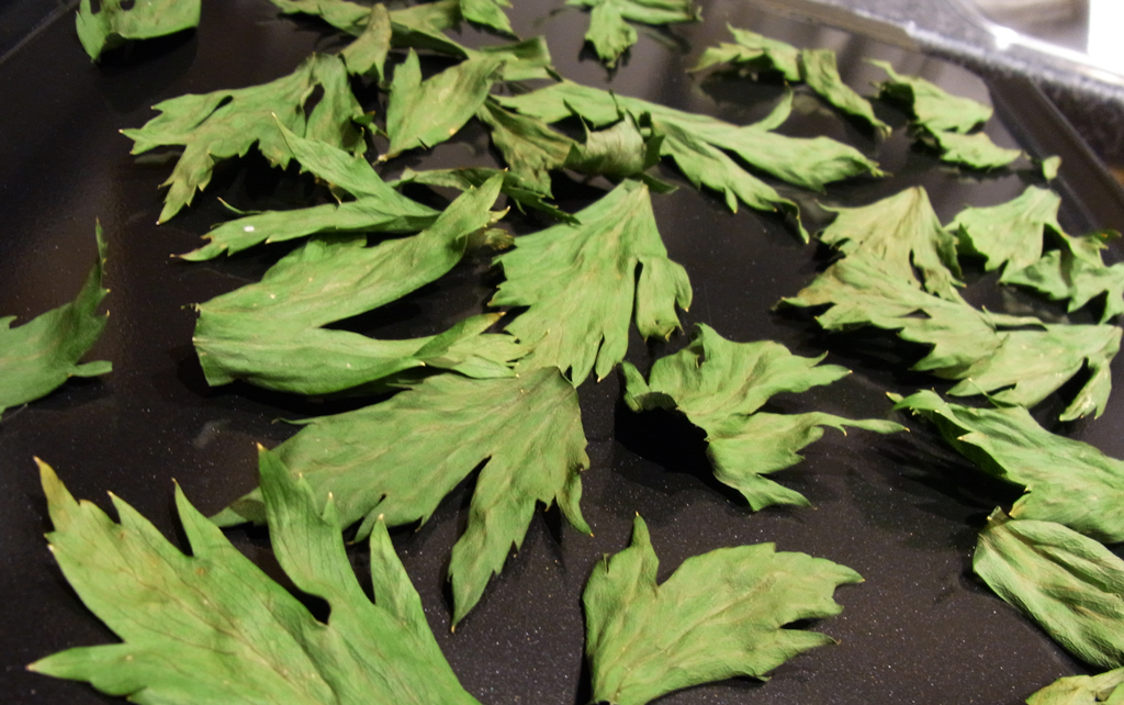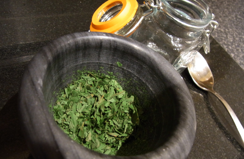 Fifteen minutes in the oven at 150C/300F dried the leaves nicely, so they were crisp but still green. That made them very easy to smash up in a pestle and mortar.