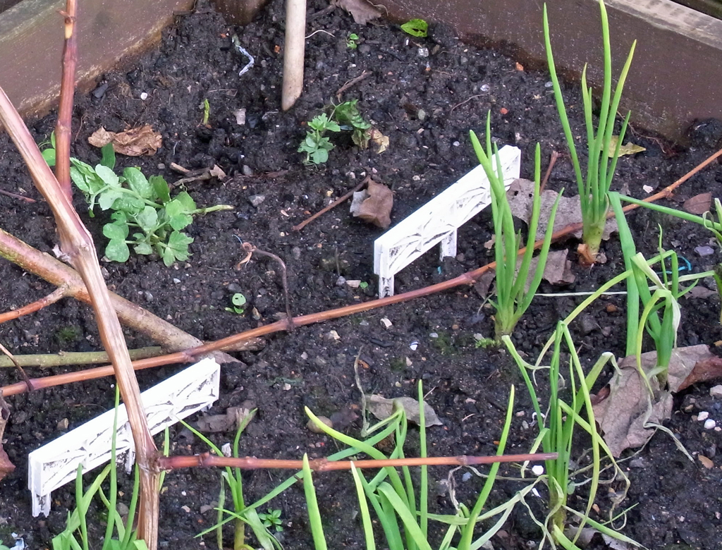 In neighbouring beds I have over-wintering onions and garlic, both of which appear to have rooted well and are topped by strong green shoots. The garlic has been sheltered by a couple of sowings of green manure. Although it really doesn’t need any weather protection, the mustard manure plants do help hide the shoots from birds, who have an awful habit of ripping them up.