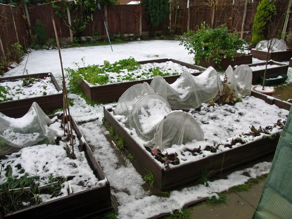 We had a great fall of snow in North West England last night, the evening of Boxing Day. A good layer quickly built up and coated the veg garden at the back of the house. By morning it was raining and the snow was starting to melt.