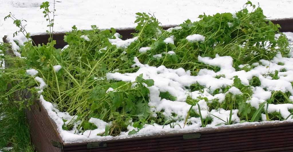 I’ve had the green manure in a couple of the raised beds over recent months, with a view to mixing it into the soil later. Once this snow thaws I’ll chop it up in situ with the strimmer and dig the clippings in with a spade.