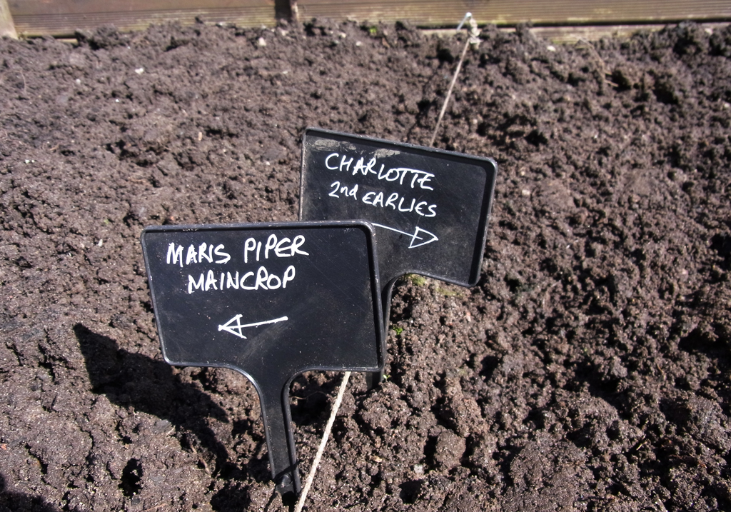 The most important thing now is to make it clear which is which. When the Charlottes are ready to lift, the maincrops will still have growing to do so I want to be sure I pick the earlies without disturbing the Maris Pipers. How handy these black plastic labels are …
