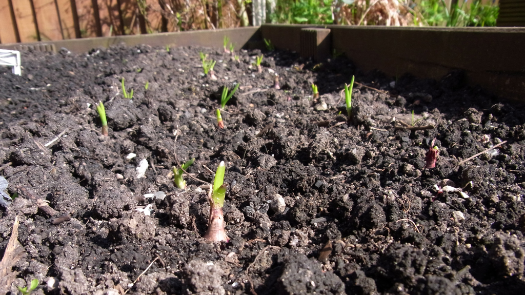 The two varieties are Charlotte, a second early, and Maris Piper as a maincrop. The sprouts or ‘chits’ had just about reached the right size at 1-2cm so in they went. There’s a good six inches of space for more soil in this bed, so earthing up the plants as they grow should work well.