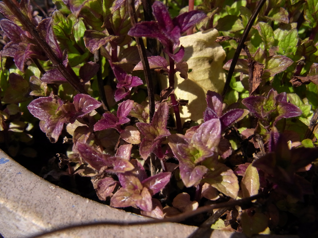 Come harvest time, it’ll be nice to accompany them with some mint. My spearmint plant, grown from seed last year, is leafing up nicely now. Today I was struck by the colour of the new leaves: a pleasant purple rather than the usual green. Perhaps they start that shade when small and turn to green later.