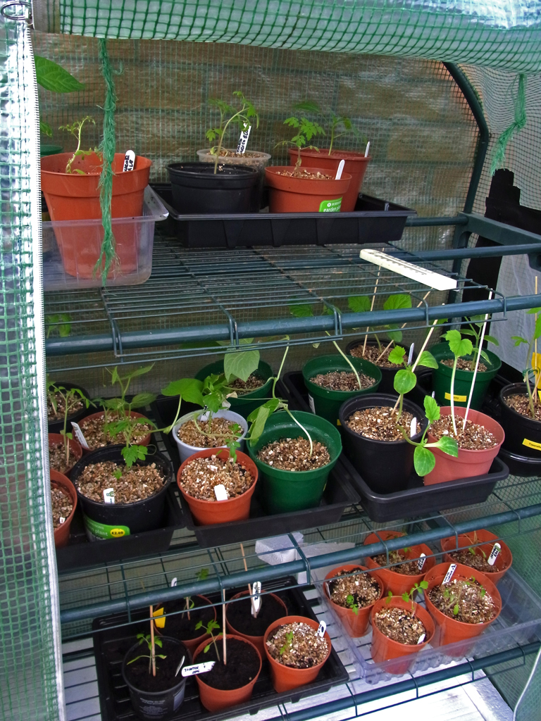 With the aim of regaining the use of the dining room, this afternoon I spent a good hour or more servicing one of the two blowaway plastic greenhouses, with a view to moving the young plants into it. I like to dismantle the structures completely then clean and disinfect them in case any moulds or infections are lingering. Once it was dry and back together I had the pleasure of filling it with young plants: tomatoes, chillis, cucumbers, squashes, brocolli and more.