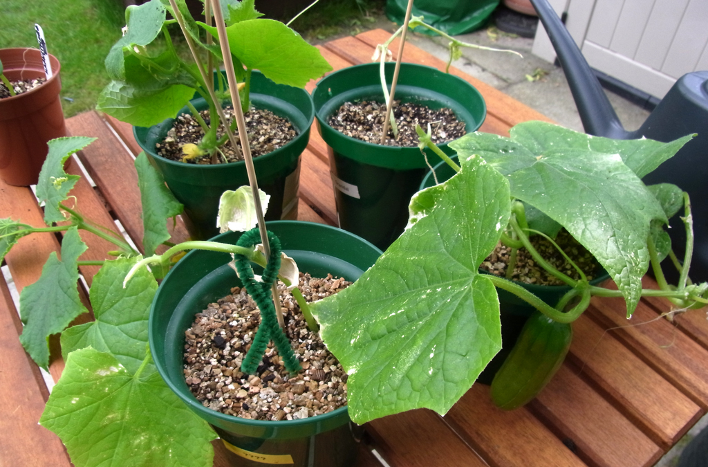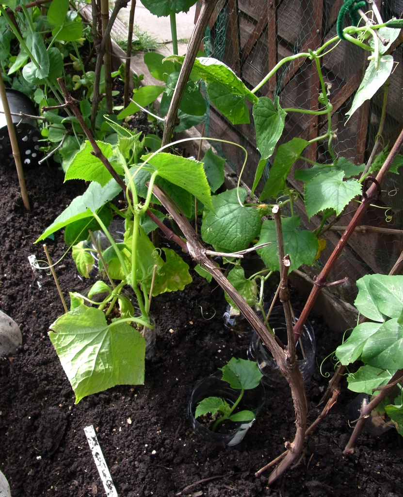 With the weather that bit warmer now, I took the cucumber plunge today and moved five plants out of their pots and into one of the raised beds. Notoriously temperamental, my cucumbers varied from healthy looking to poorly looking.