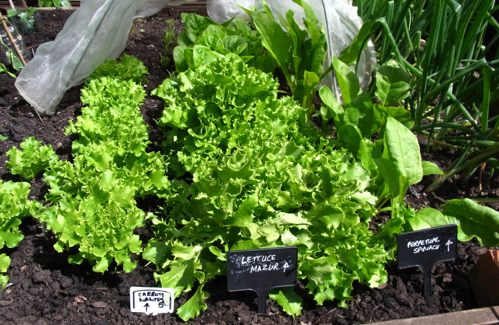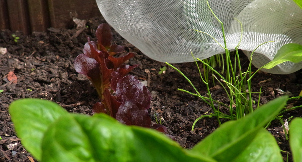 In the same bed the lettuces are coming along well. The frilly Mazur variety have already graced my work sandwiches, but I’m letting the Little Gem, just beyond them, heart up more before lifting any.