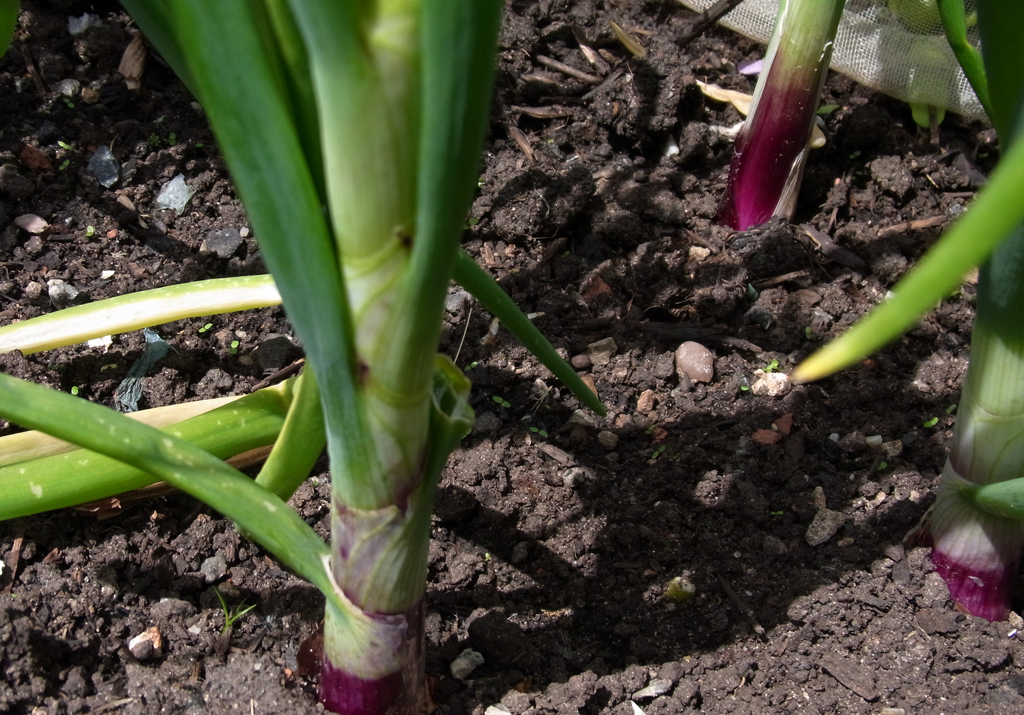 The red onions were planted just over two months ago and still have a lot of growing to do. Nearby are the over-wintered Japanese white onions I planted as sets back in October. After nearly eight months in the ground, they’re taking on their round shape well.