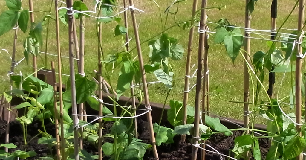 I got through a lot of bamboo and string later, making some structure for the Spagna Bianco bean plants to support themselves against. These are the reserve plants I grew when the originals were ravaged by some soil-borne pest a while ago.