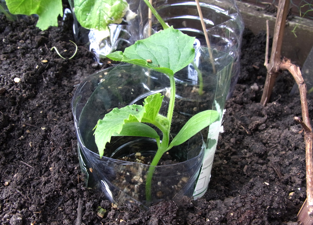 In the ground, the plants’ bases are protected by old plastic water bottles, not just as a barrier for slugs. Cucumber stems don’t like getting wet at all and will easily rot if they do. The plastic barrier should help keep them dry come watering time. Higher up, the plants are supported by branches that I cut off the dormant grape vines in February.