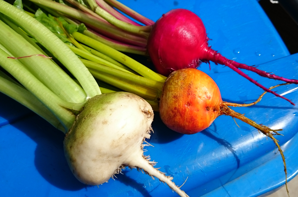 For me, this is one of the best times of the vegetable growing year. Root crops have been rapidly swelling and there is so much lovely food to pick and enjoy. First out of the ground today was this trio of beetroots: one each of Detroit White, Golden and Chioggia.