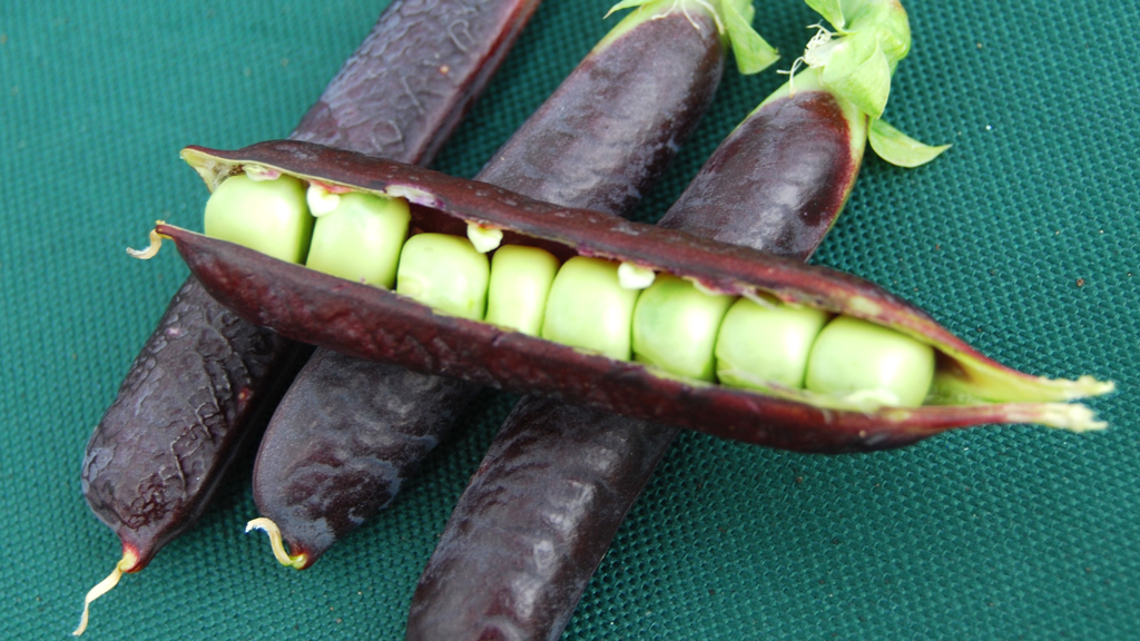 The purple pods on the right? They’re Blauwshockker peas from Germany. Their deep purple pods contain thick juicy peas which cook in a moment and fairly burst in your mouth. Yum!