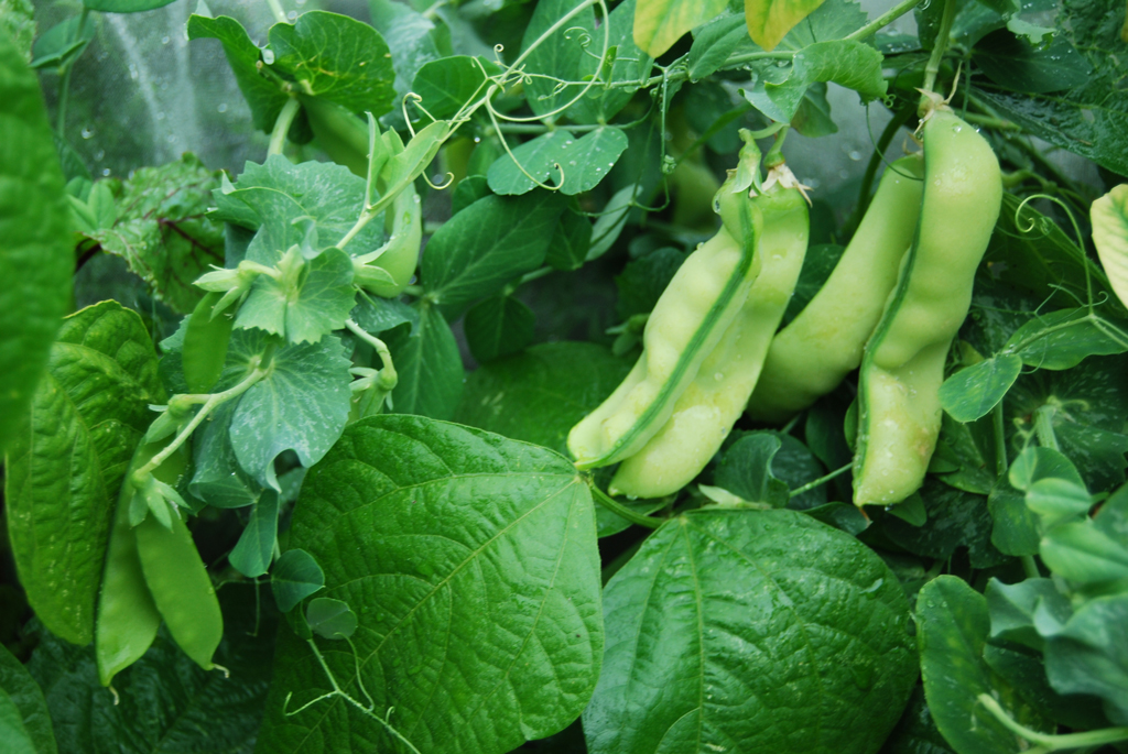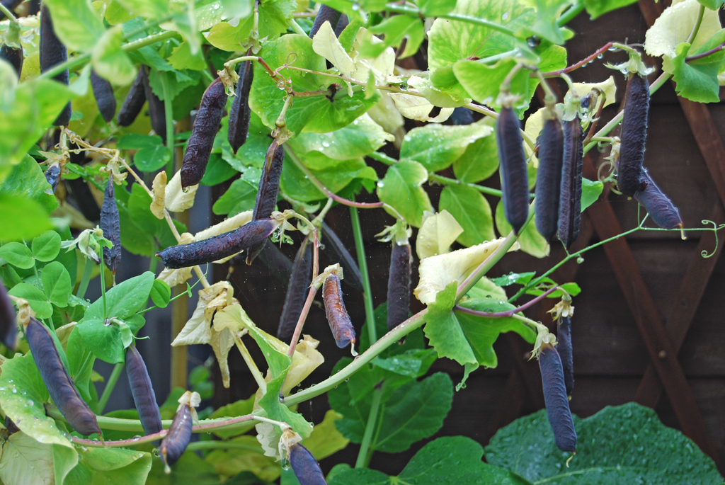 In the raised beds, all the pea plants had pods ready for picking. Most striking, and indeed most prolific, are the Blauwschokker plants.