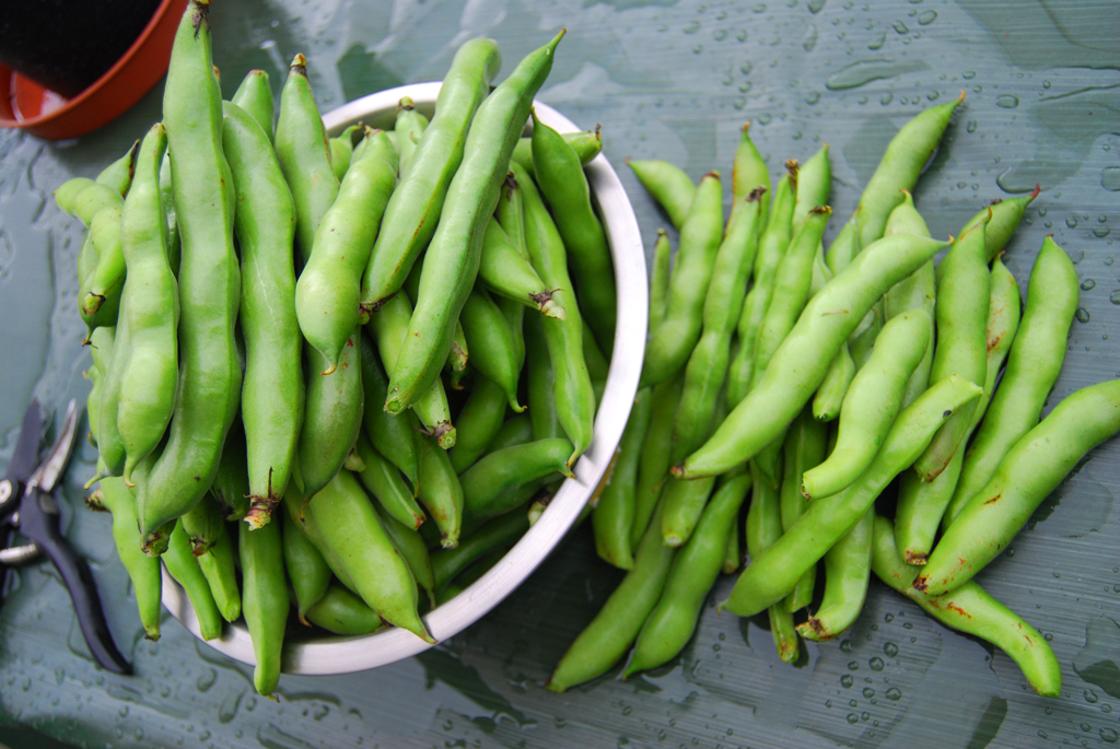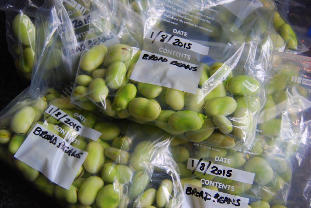 Beans made their way indoors too. Seven and a half pounds / 3.5 kilos of The Sutton broad beans made for a good haul. Podded, that went down to 3 pounds / 1.4 kilos, most of which was bagged up and went into the freezer. There are still quite a few growing outside, as I staggered the planting earlier in the year.
