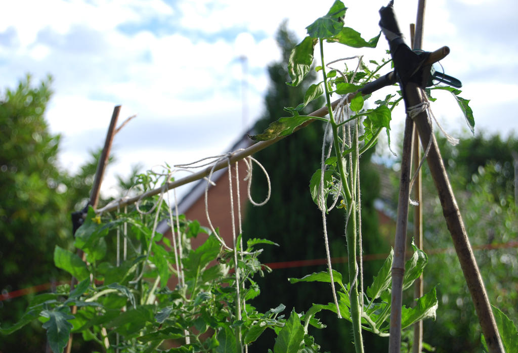 I rigged up a frame and tied the taller plants to a horizontal cane. They’re still slightly delicate from being in the plastic tents. They were cramped while under cover, with little airflow and it was difficult to trim them. Now they’re outdoors it was easy to spot and pick off side shoots and trim off weak lower leaves.