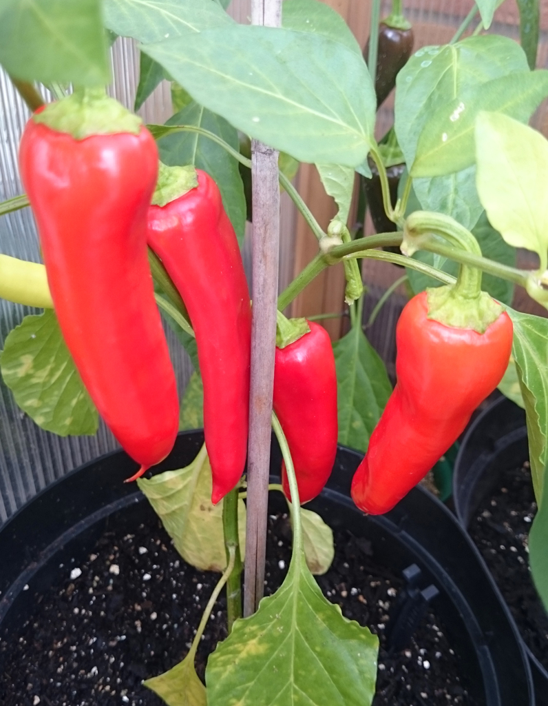 I’ve a few plants of a Czechoslovakian sweet pepper calles Semaroh, from the wonderful Real Seeds. Unusual varieties are always tempting to try and I was won over by a photo showing long multicoloured peppers. Mine aren’t showing the same yellow and red shades but there are some individual fruits which are red and green at the same time. That multicoloured thing on peppers and chillis I find mesmerising.