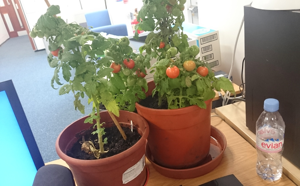 I like to have a few tomatoes with lunch at my desk in work, so a week ago I took my three Tiny Tim plants to the office. In a warm position next to my computer they’re doing very well, thankfully not alll ripening at once, as that would make for a very tomatoey lunch!
