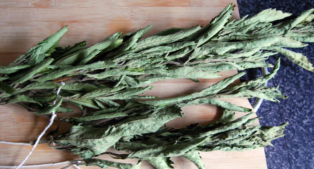 .I’ve had bunches of stevia leaves hanging up to dry for a few weeks and saw today that they were fully dehydrated. Stevia is the increasingly popular leaf that can be used as a sugar substitute.