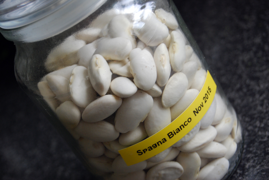 Also fully dried were the saved Spagna Bianco beans. Taking them out of the pods is quick and easy and after discarding any imperfect ones I was left with a jar full of beautiful white pods.