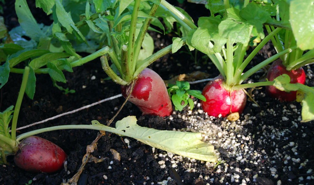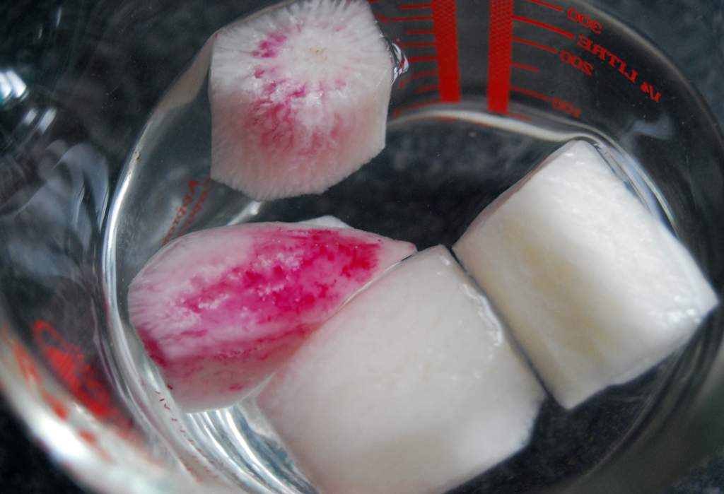 Nearby there are late radishes ready for picking. I lifted a few today and after slicing them into chunks and covering them in cold water noticed that some had the scarlet colour of the skin actually running through the flesh, in a mottled pattern. I’d not seen that before and thought it looked very attractive.