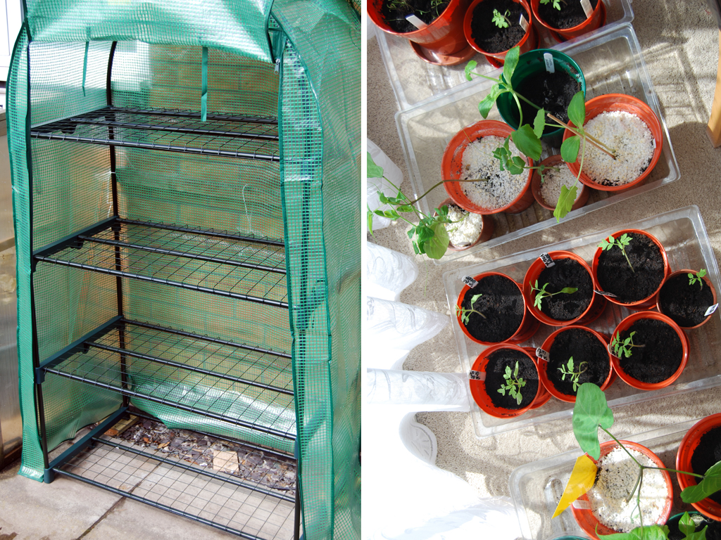 The pesky low temperatures also account for the rare sight of two completely empty mini greenhouses. They’re new, replacing a couple of tatty ones, and are safely tied to the south-facing back wall of the house. But until they warm up inside there’s an ever-expanding jungle of vegetable plants indoors.