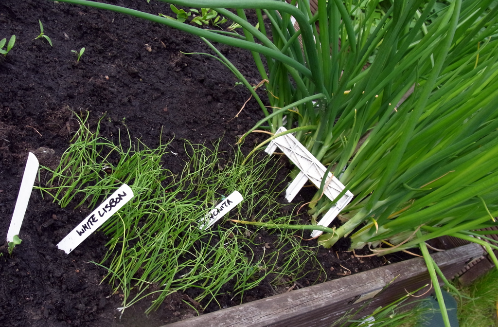 I seem to be having unusual good fortune with spring onions this year. They don’t always work for me but the over-wintered White Lisbon are huge and delicious. They overlook a small patch of standard White Lisbon and some Japanese Shimonita, all of which have sprouted really well.