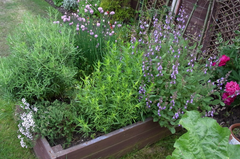 In the herb bed several of the plants are now in flower: from tiny white thyme flowers to the pink pom-poms on top of the chives and delicate lilac flowers on the sage. The mix of aromas when you accidentally on purpose brush against these plants is mesmerising.