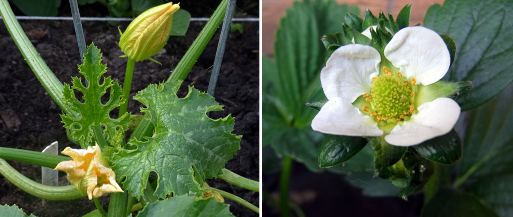 Now in flower: courgettes and strawberries