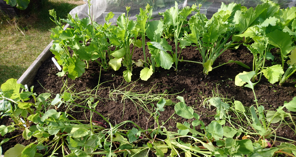 Whether it was residue seeds of some previous green manure, or just genuine new weeds that had floated in from the air, a mass of tangly knotty green stuff had interspersed, interjected and downright interfered with most of the raised beds this month, no doubt boosted by the glorious weather. A good session of picking it all out this afternoon certainly made things a lot neater, but also reminded me that I needed to thin out various plants which I’d sown without due care and attention earlier in the season.