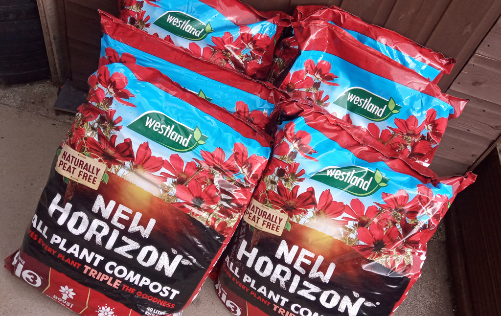 As the potato leaves grew upwards I kept topping them up with some lovely peat-free compost I got from Marshalls.  It was pricey at £8 a bag, but still cheaper than some of the outrageous charges some outlets have been asking for compost.  Profiteering during a shortage isn’t a good look.  Anyway this is a new favourite: rich and full or organic matter, but needs lots of watering as a result to keep the growing potato haulms in water.