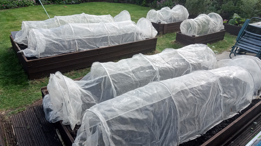 The main beds, with mesh tunnels protecting rows of carrot, beetroot and other seedlings.