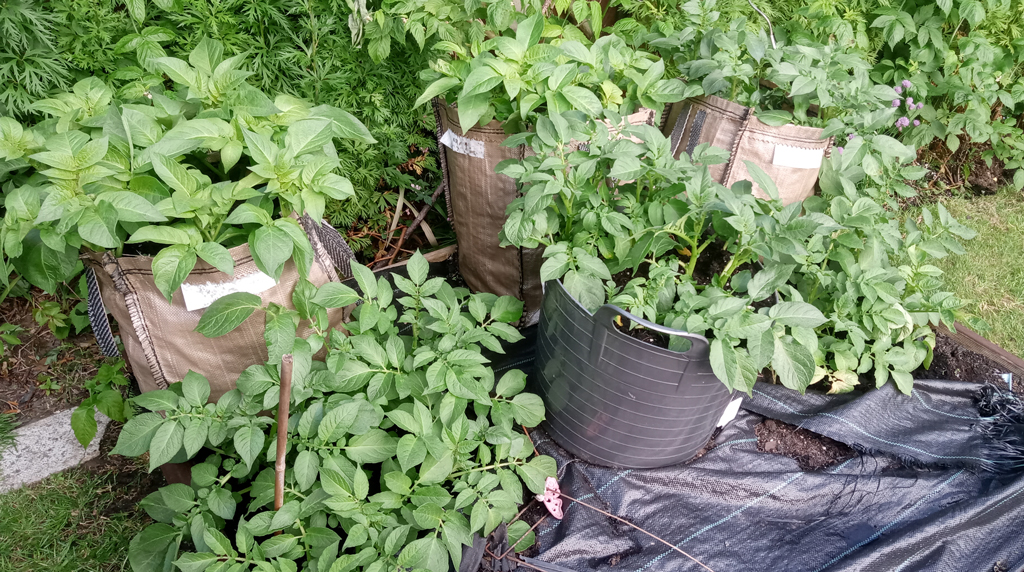 Alongside, the potatoes are growing away in sacks and in the ground.  Back in March I bought seed potatoes of two varieties:  Charlotte earlies and a first-time grow for me: Shepody maincrops. I chose the latter because they’re one of two varieties managed by McCains. Yes McCains as in oven chips.  They’re supposedly great for making chips, as you’d expect, and I’m looking forward to putting that to the test around August.