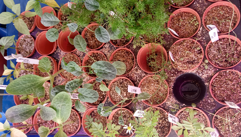 I started sowing back on 1st April and one of the first things to go in the propagators was marigolds, which will attract bees to the veg plants which need pollinating.  Don’t marigolds have the most amazing seeds? With their points and feathered flights I can picture Lilliputians playing darts with them. Anyway, I now have four healthy marigold plants ready for potting on.