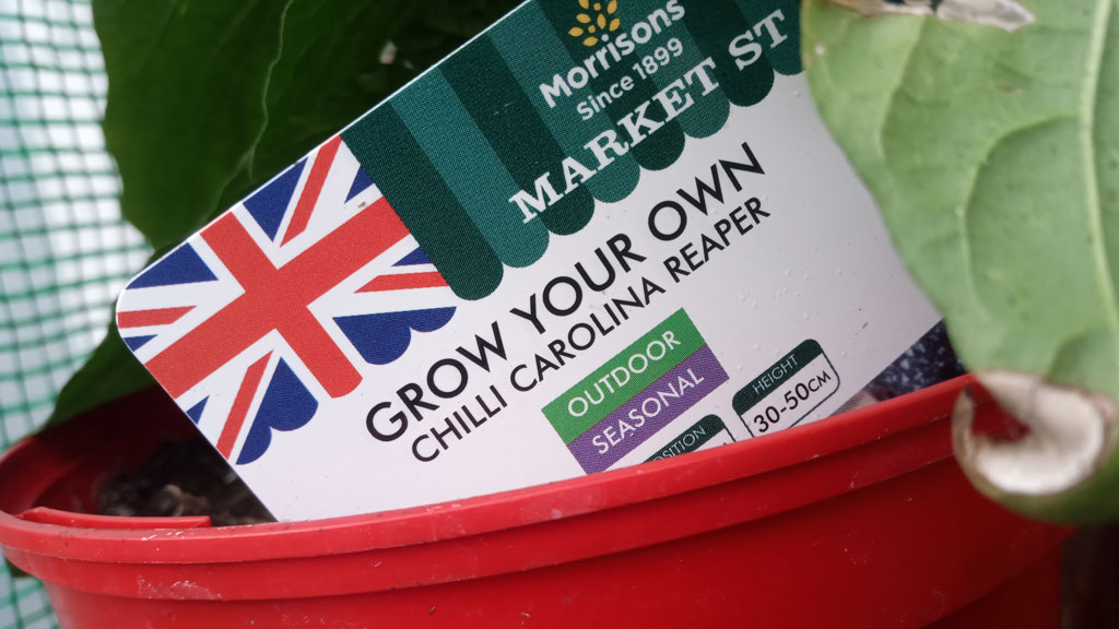 It was a real surprise a couple of months back to find some young extreme chilli plants on sale in Morrison’s, among the herbs and house plants. The inevitable consequence was that I now have two crazy chilli plants growing away in one of the tent greenhouses.