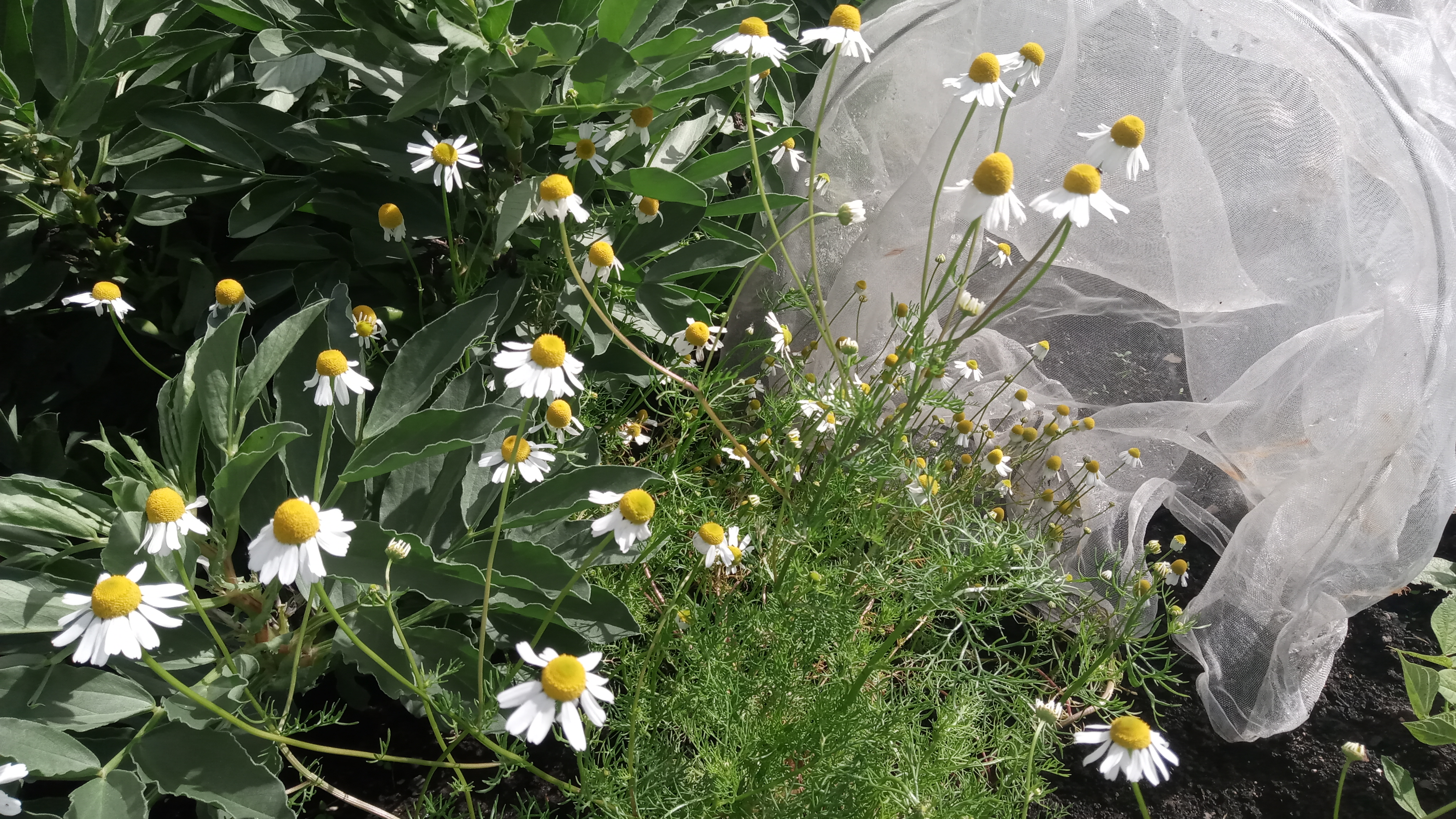 Home-made chamomile tea is a favourite drink of mine, so it’s good to have two big clumps of plants on the go. One survived over winter from last year, while the other, a wild chamomile, started out as seeds in the propagator a few months back, was planted out just a few weeks ago and has thrived ever since.