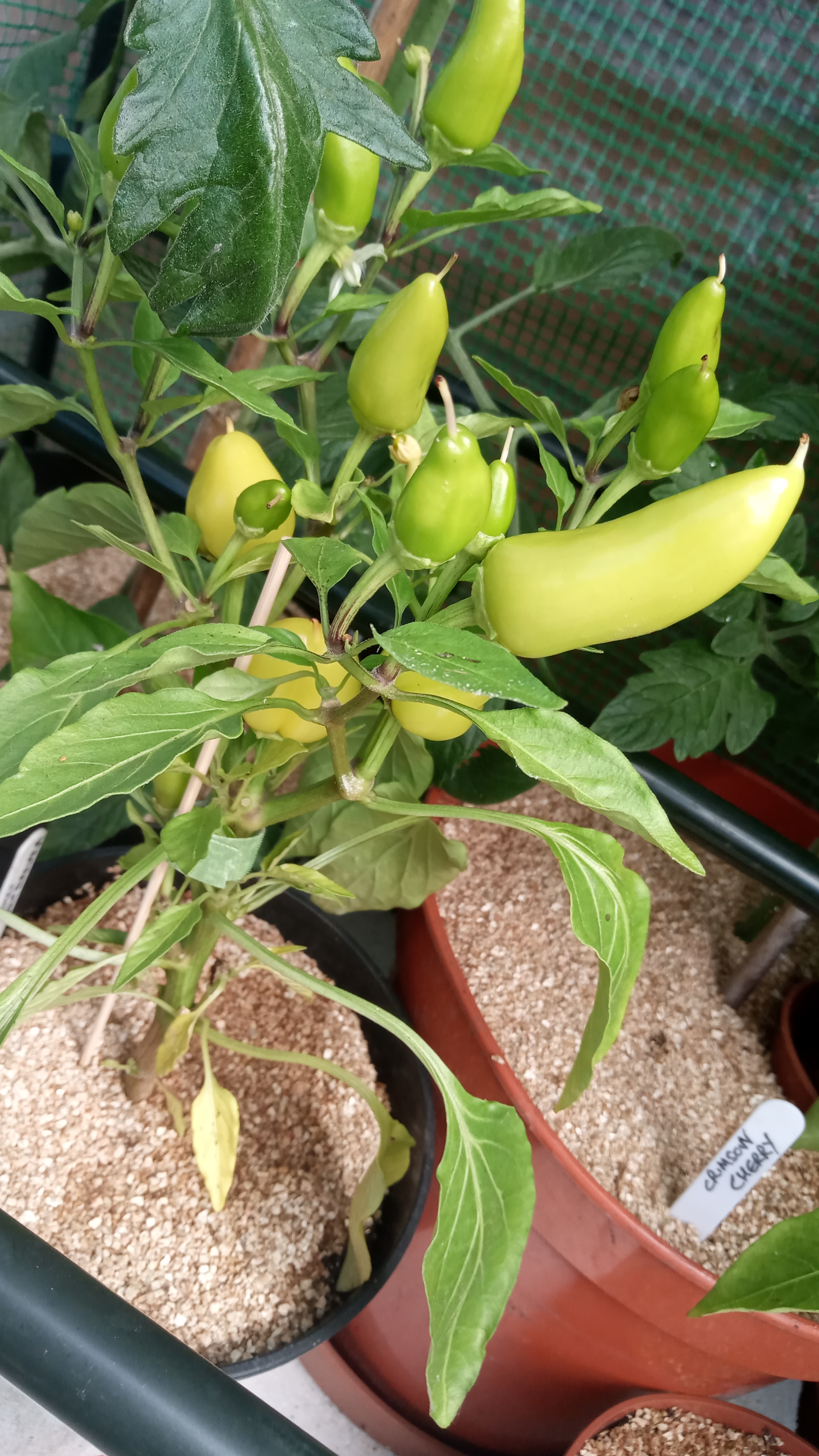 Finally come various chilli and sweet pepper plants, some of which are now fruiting – aided I’m sure by placing marigolds all over the place to attract the pollinating bees and hoverflies. The furthest ahead so far are a couple of ‘hot banana’ chilli plants.
