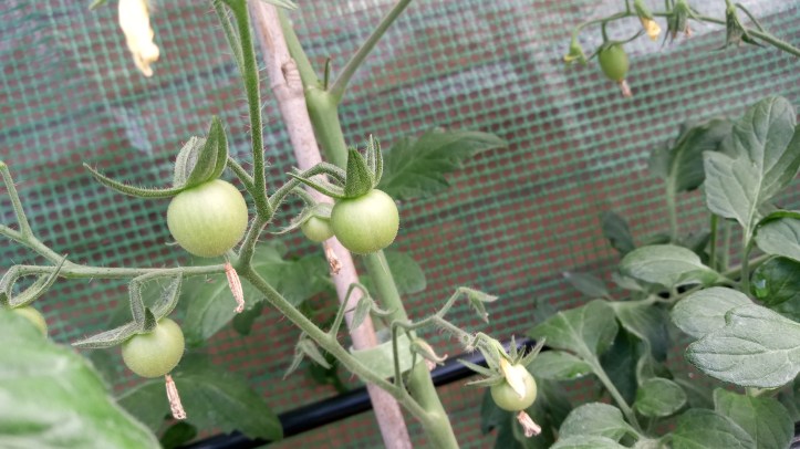 Nearby there are little tomatoes forming on many of the dozen or so tomato plants. I’ve got a couple of the Crimson varieties (supposedly blight resistant to a degree) in pots in the open air, with others in tall versions of those plastic greenhouses. There’s Aviditas, Tomatoberry and a couple of small Tumbling Tom plants – all doing OK.