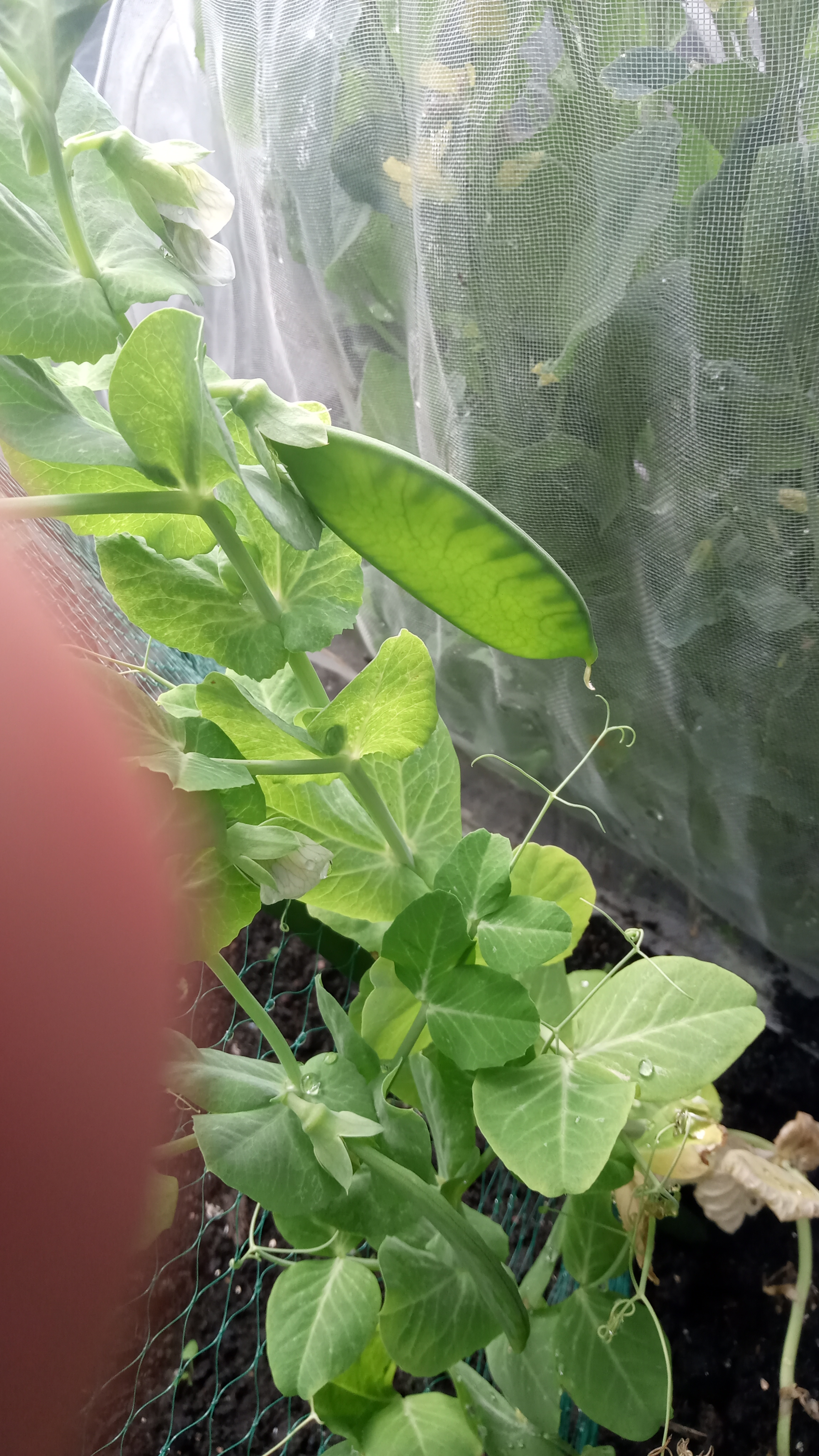 As are their neighbours the peas. Earlier in the season I found a small unlabelled bag of peas, I think from a variety pack of seeds, and threw them into some compost. Now they’re planted out, climbing healthily up some support netting and putting out their first pods. I can’t tell whether they’re meant to be mangetout, as they look at the moment, or are a true pea variety where the pods will fill out soon. I don’t mind to be honest – either is enjoyable.