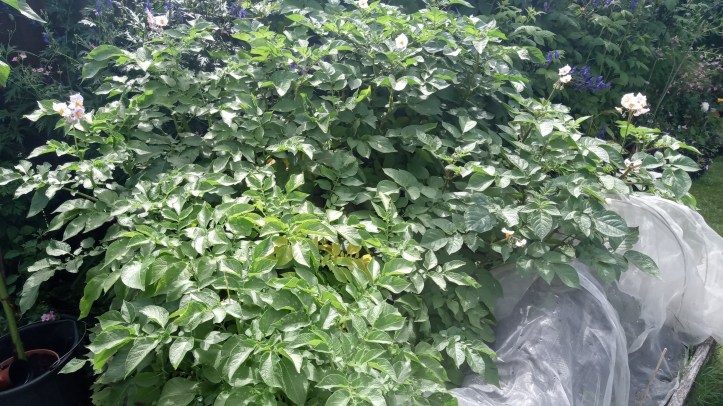 The four potato grow-sacks have now disappeared under an almost Amazonian potato leaf forest, which is now flowering. There are two varieties at play: Charlotte second earlies and Desiree maincrops. I heard just recently that spuds do best in poor soil, without being fed much. If that’s the case I must admit I’ve been doing it wrong, tending to put them in very good compost and adding fertilizer on occasions throughout the season. So I’ll just water them from now on and see how it goes. Will definitely try the spartan approach next year though.