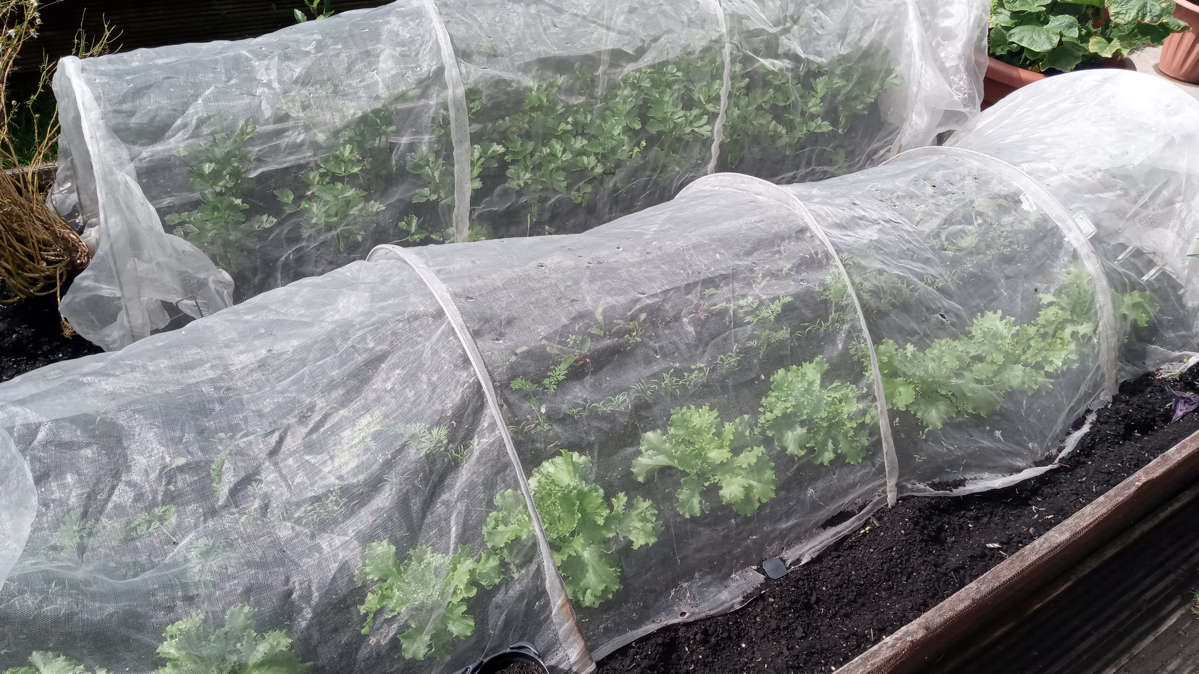Luckily I got the covers on just before the first cabbage white butterfly appeared in the garden a few days ago (or caterpillar factories as I call them). Their potential to devastate crops is not unknown to me: I still retain a nervous disposition from finding hundreds of caterpillars in one of the big raised beds when chopping down some failing leaf plants a few years back. So good covers pinned down over the brassica crops, a fine mesh, tightly secured, are a no-brainer round here.