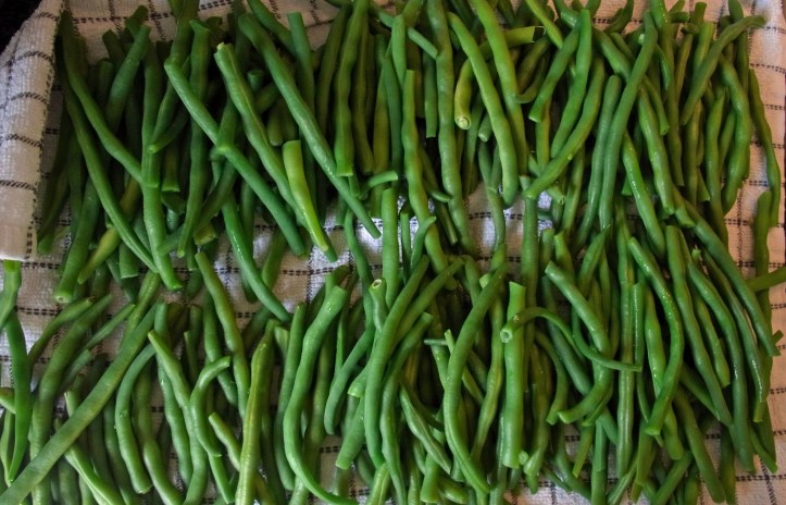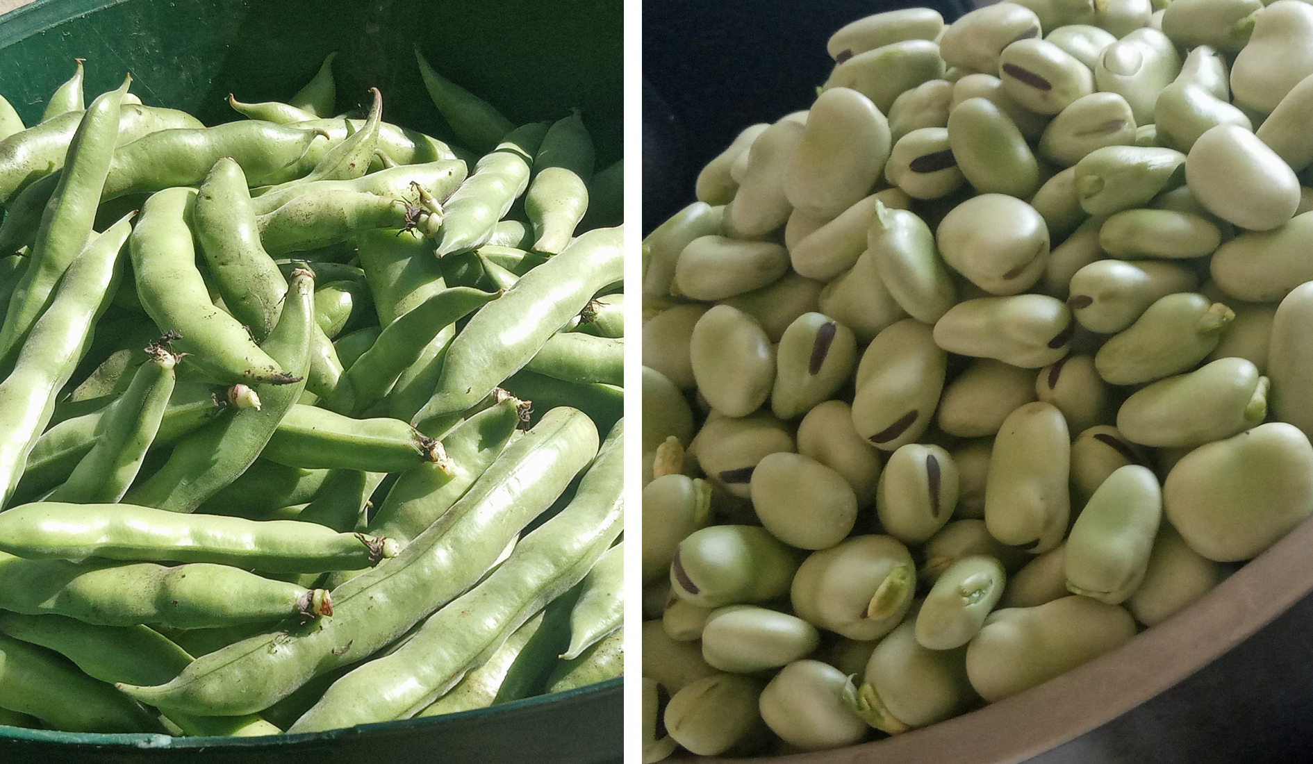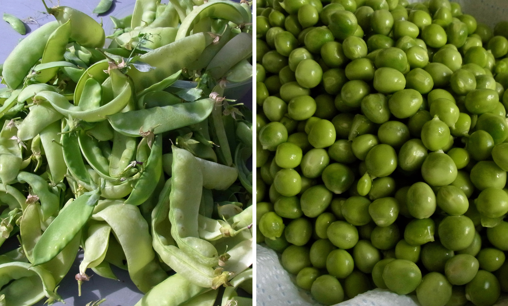 When returning from holiday a while back, the mangetout (variety Carouby de Maussane) had all filled out to fully grown peas in the heatwave. It was a bit labour-intensive to shell them all but a labour of love and, after blanching them, I ended up with a huge bag of peas in the freezer. Not long after the broad beans got the same treatment: a big flexi-bucket made for 4 kilos (about 8 pounds) of the Sutton variety. Likewise a whole load of Castandel french beans.