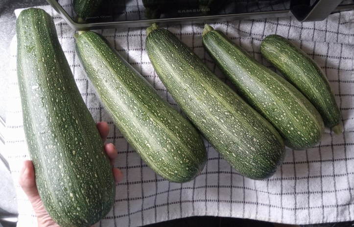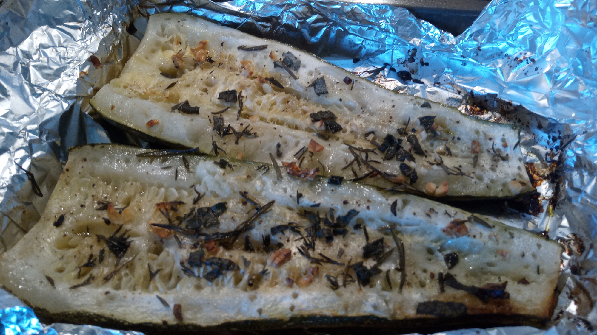The other notable output of the heatwave was some huge courgettes. I’d removed every one before going away, but just two weeks later there were some giants. I tried halving and roasting one and it turned out very nice, especially when sprinkled with a mix of herbs from the herb bed.