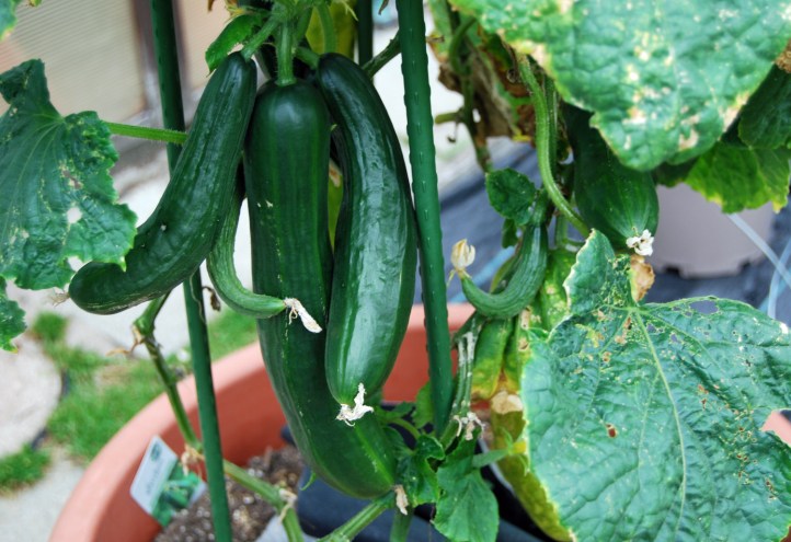 Still at the green end of the spectrum, the cucumber plants are having a final flourish. There are three plants in this large pot and, again through not being able to eat them as soon as they’re ripening, a couple of them have large cukes which are yellowing. But this one is putting out perfect dark green and slim cucumbers. I’ll concentrate on eating those now.