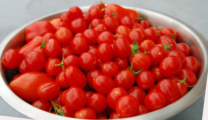 With a vague idea of roasting them, I picked and weighed out a total of 8 kilos (four pounds), which with small tomatoes like this variety is quite a few. A few neighbouring Roma, which are much larger, made it into the mix as well.