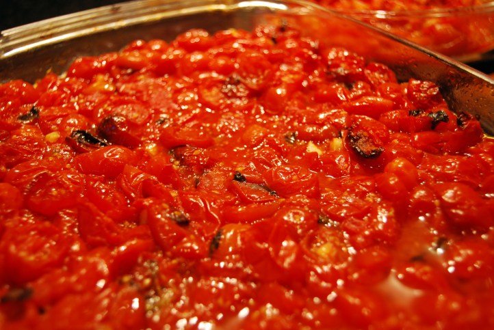 After de-stalking and washing, they went into a number of roasting dishes along with freshly picked oregano, chopped garlic that I lifted a few weeks ago and some salt, pepper and nut oil.