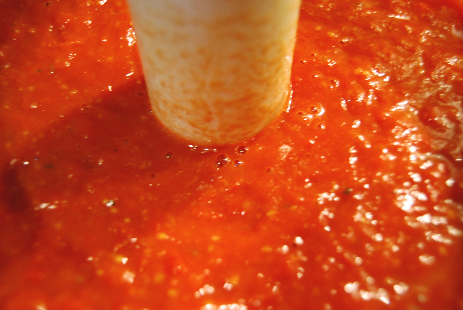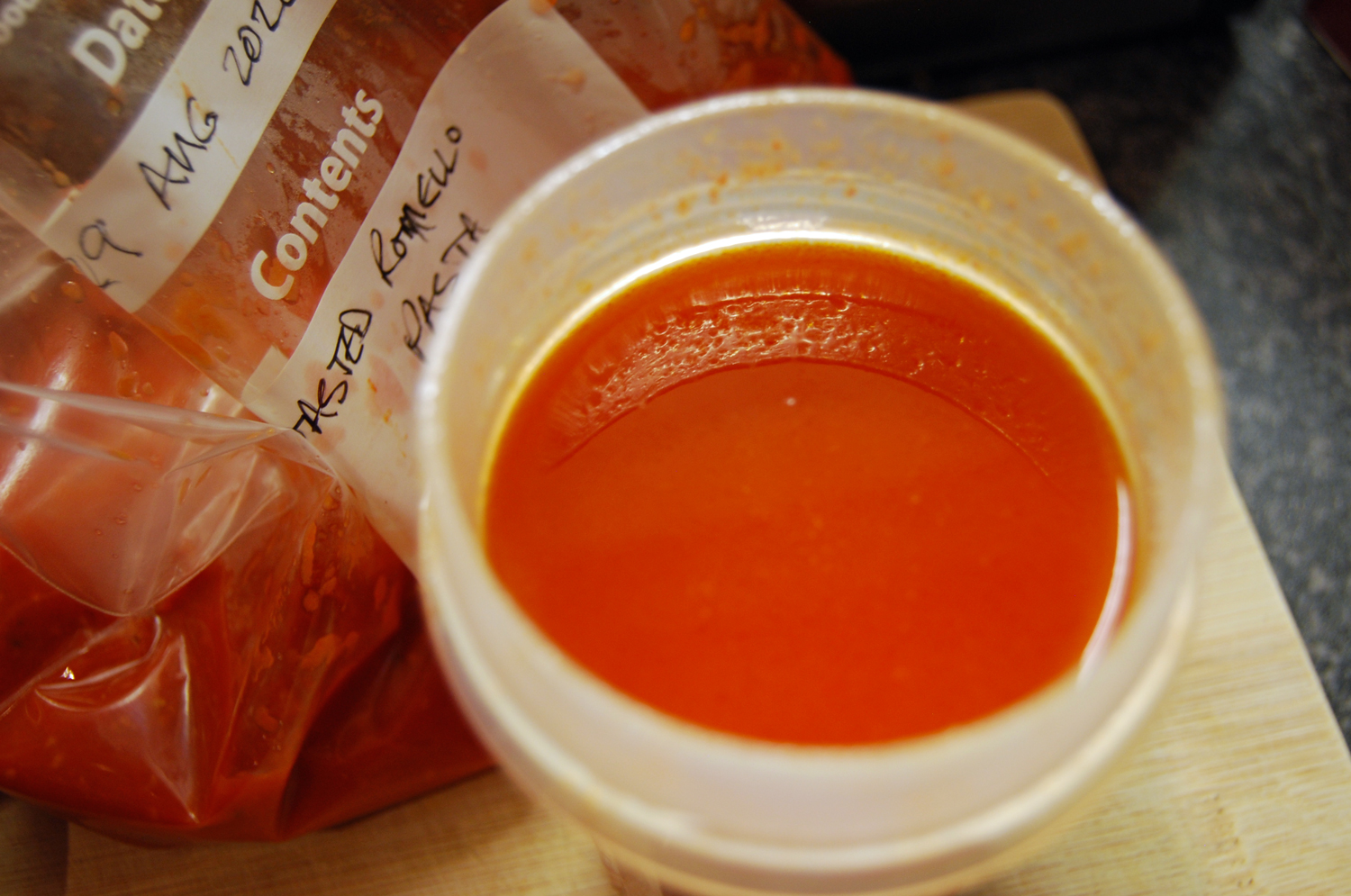 Several bags of this delicious passata are now in the freezer, minus a few spoonfuls consumed for research purposes 🙂 and some of the excess liquid went through a sieve, to leave this silky tomato sauce, which is ready in the fridge for pouring onto well just about anything.