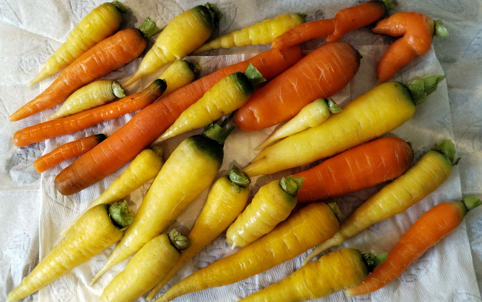 These started as a seed tape from Suttons, containing a mix of Amsterdam Forcing 3, Early Nantes 5 and St. Valery. That means some are orange and others yellow, as well as being different shapes and sizes.
